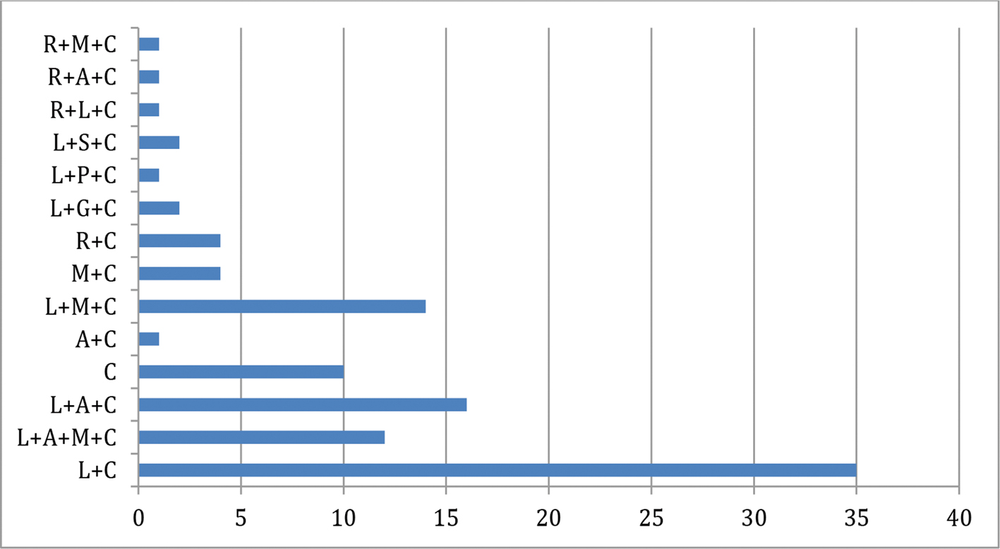R, rhinoplasty; M, breast implants; C, rib removal; A, tummy tuck; L, liposuction; S, scar revision; G, gluteal implants.